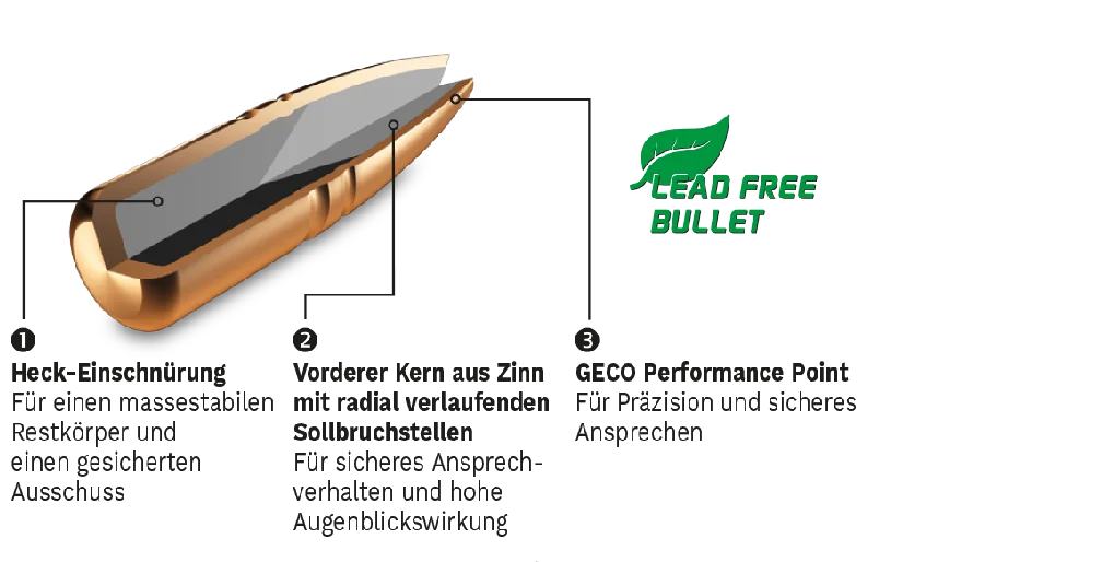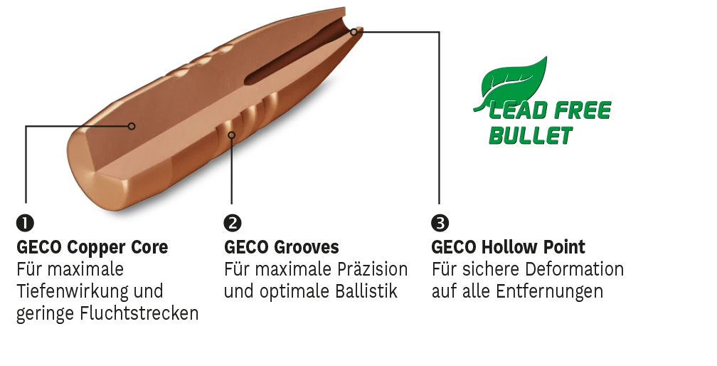 Die modernen bleifreien GECO Geschosse bieten herausragende ballistische Eigenschaften und Präzision, was die Erfolgsquote und Effizienz bei der Jagd steigert.Preis-Leistungs-Vorteile: