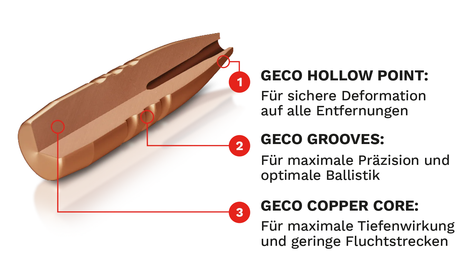 Die bleifreie Jagdmunition von GECO steht für präzise Flugbahnen, hohe Energieübertragung und wiederholgenaue Schussergebnisse. Jede Laborierung wird unter realen Jagdbedingungen getestet, um maximale Treffsicherheit und Konsistenz zu gewährleisten.