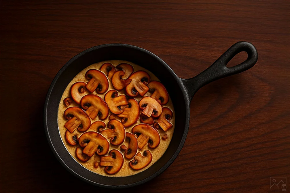 Butter in einer gusseisernen Pfanne zerlassen und die Zwiebeln darin glasig braten. Die Pilze zugeben, mit Salz, Pfeffer und einer Prise Zucker würzen und bei mittlerer Hitze rund 5–8 Minuten anbraten. Sahne hinzufügen und kurz einkochen lassen. Warm halten.