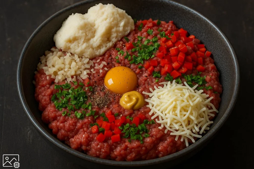 Toastbrot in Milch einweichen und ausdrücken. Zwiebel und Knoblauch fein hacken, Paprika in sehr kleine Würfel schneiden. Alles mit Wildschweinhack, Ei, Senf, Gewürzen, Petersilie, Brotmasse und Mozzarella gründlich vermengen. Die Masse kräftig durchkneten und 10 Minuten ruhen lassen.