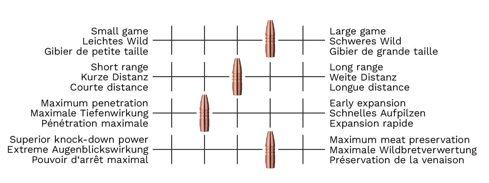 Aufgrund der massiven Hohlspitze deformiert das Geschoss zuverlässig auf nahezu allen jagdlichen Entfernungen. Darüber hinaus verfügt es über eine hohe Eigenpräzision, die insbesondere durch die eingebauten Geschossrillen (GECO Grooves) gewährleistet wird.  Die hohe Massestabilität geht einher mit einer hervorragenden Tiefenwirkung, die vor allem bei schwererem Wild essentiell ist, um einen sicheren Ausschuss und Pirschzeichen zu gewährleisten.
