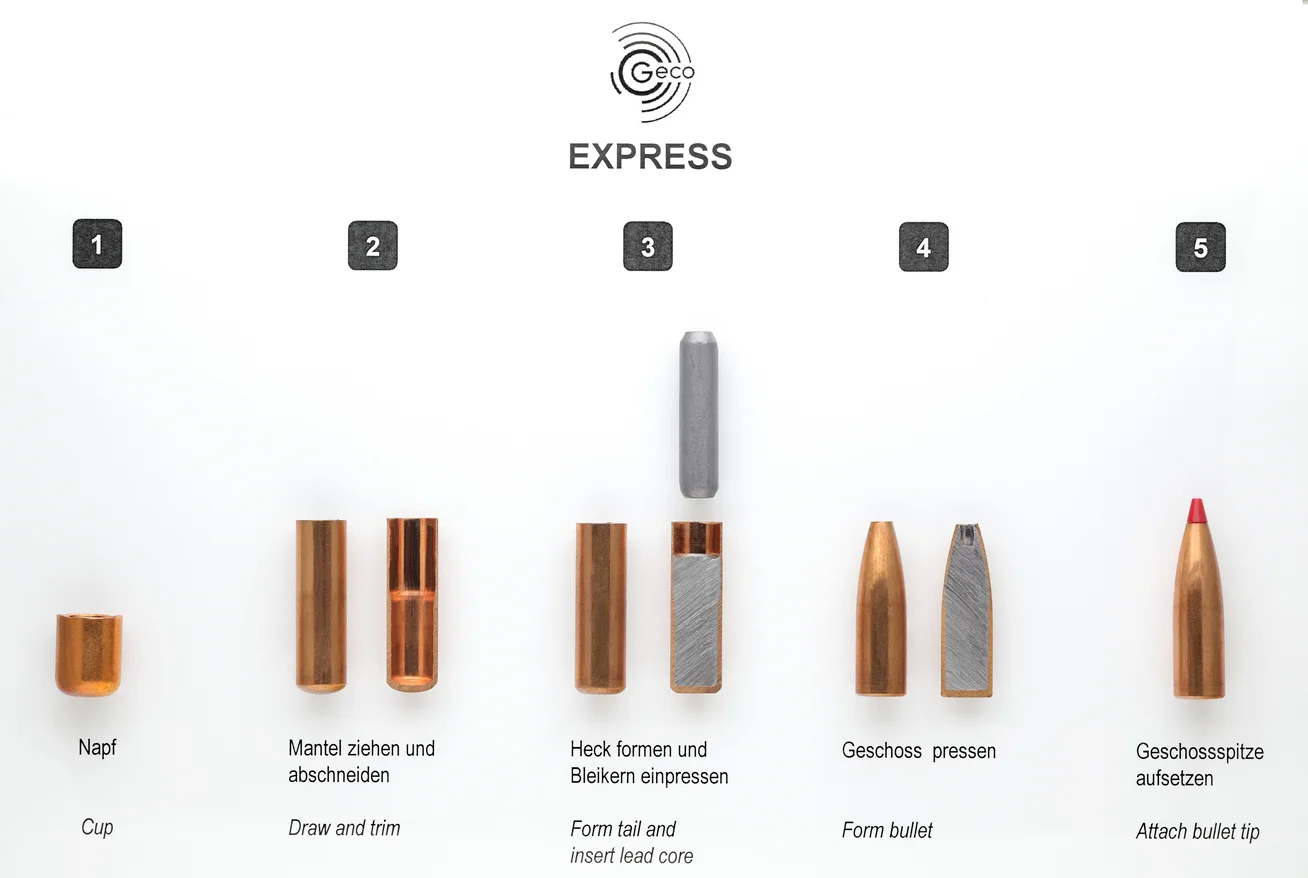 Das GECO Express besteht klassisch aus einem Bleikern und einem Tombak-Mantel. Der vorgeformte Geschossnapf wird in zwei Schritten tiefgezogen.