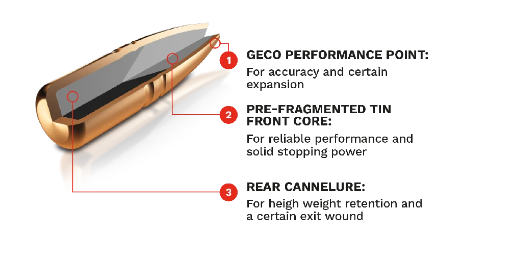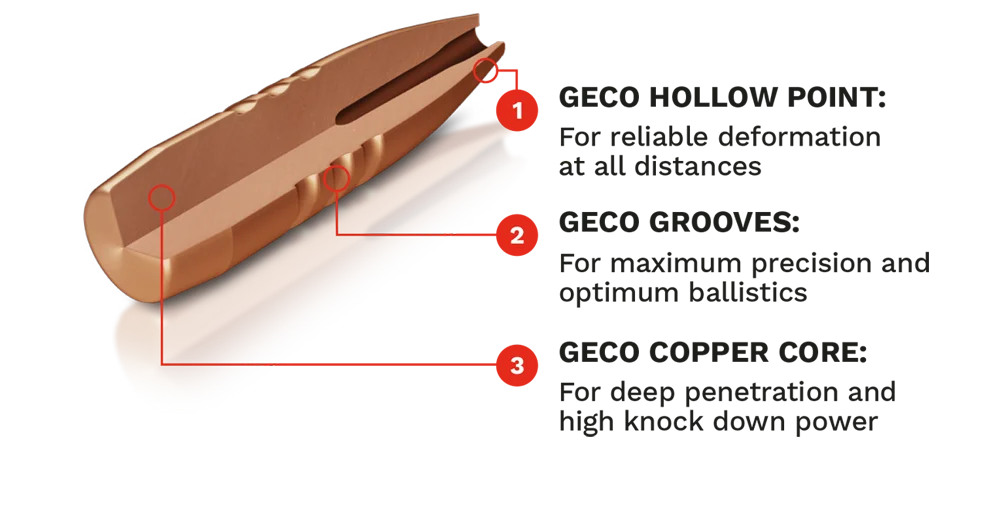 GECO's modern lead-free bullets offer outstanding ballistic properties and precision, which increases the success rate and efficiency in hunting.Price-performance advantages: