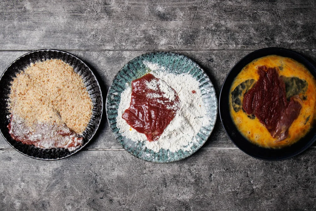 Cut slices the thickness of a finger from the top piece across the grain. Carefully plate these individually between two sheets of cling film, using a plating iron or a heavy frying pan, from the inside outwards, as thinly as possible. Do not beat them. Lightly season the schnitzels on both sides with salt and pepper. No more seasoning is needed.