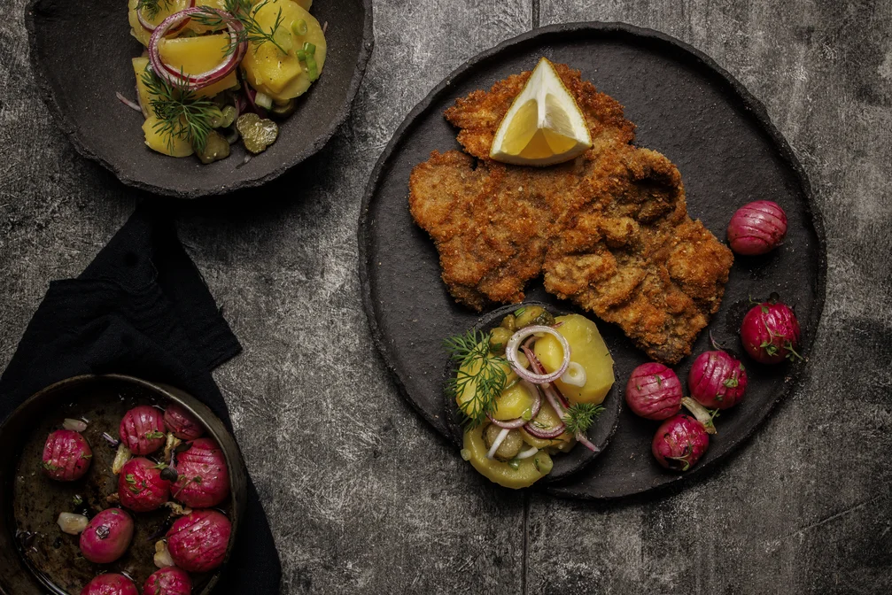 Schnitzel is always a good idea, any time of year. At GECO, we like it Viennese-style best, prepared exactly like the original from Austria, with a fine breadcrumb coating and fried until golden. We serve our GECO schnitzel, cut from venison topside, with classic potato salad and oven-baked radishes.