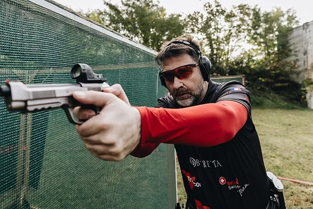 For competitions, he uses GECO 9 mm Luger/124-grain FMJ ammunition from his Beretta 92x Performance. For training, he uses his tried-and-tested hand-loaded cartridges, consisting of Reload Swiss RS12 powder and 124-grain GECO FMJ bullets.
